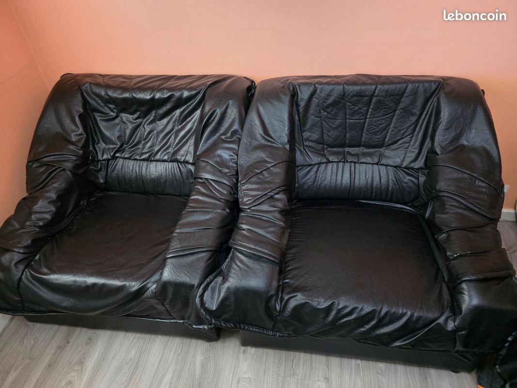 🚨 URGENT – À DONNER contre débarras rapide 🚨 Canapé 3 places + 2 fauteuils en simili cuir noir